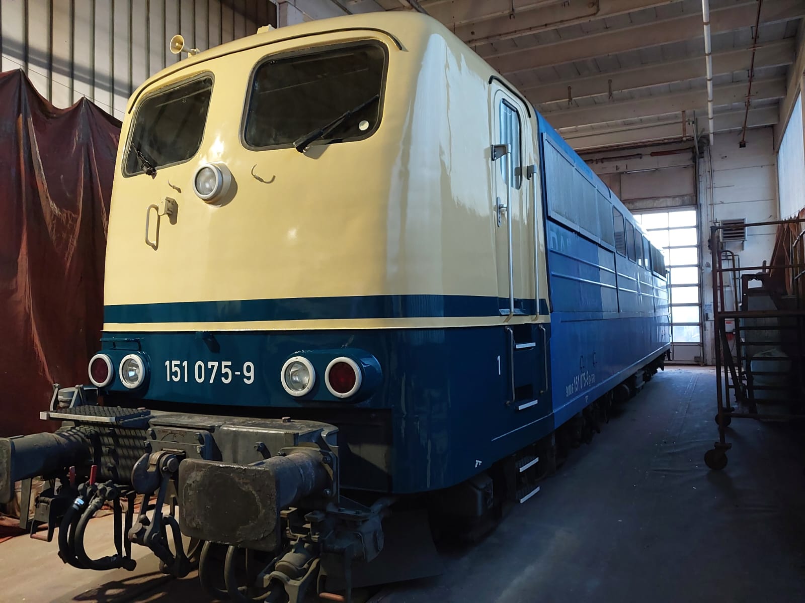 Unsere Elektrolok 151 075, liebevoll „Martina“ genannt, hat in diesem Monat in Saarbrücken eine umfassende Auffrischung erhalten. Das bisherige silberne Gesicht gehört nun der Vergangenheit an: Die Lok zeigt sich wieder vorne wie hinten in Elfenbein/Ozeanblau, wie es bereits Mitte der 1970er Jahre üblich war. Der mittlere Bereich des Lokkastens trägt derzeit noch die Beklebung des Vorbesitzers, der Railpool.